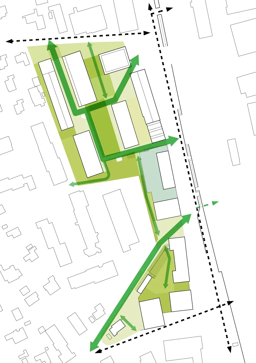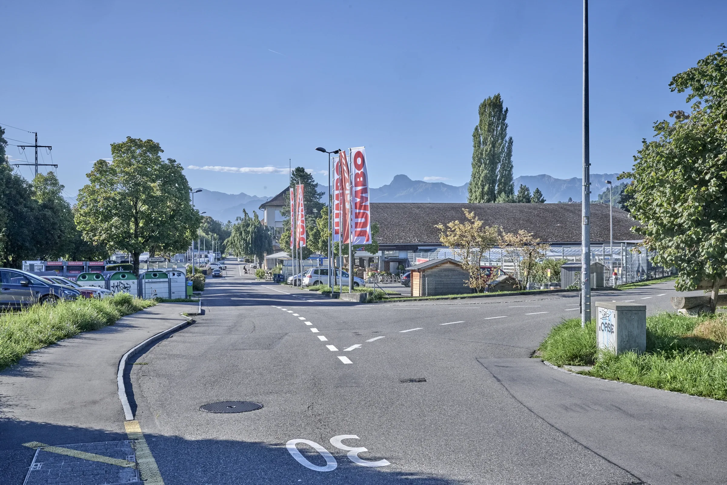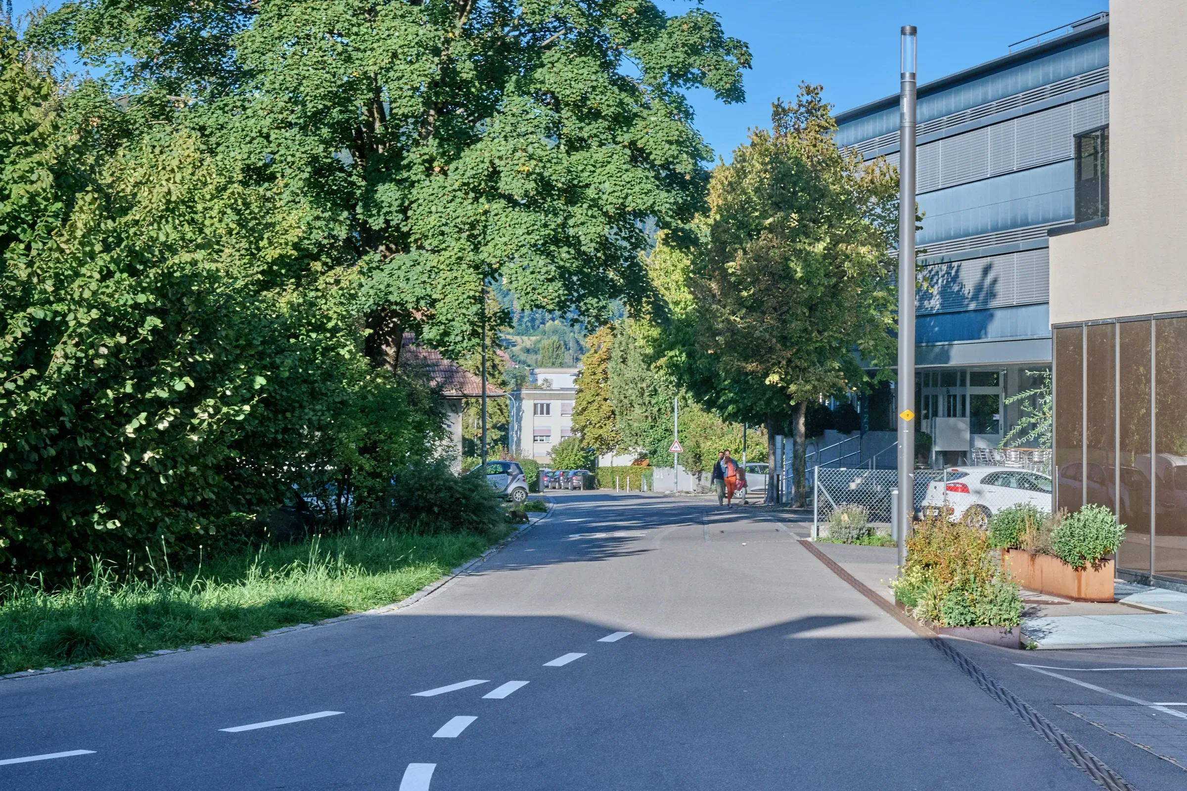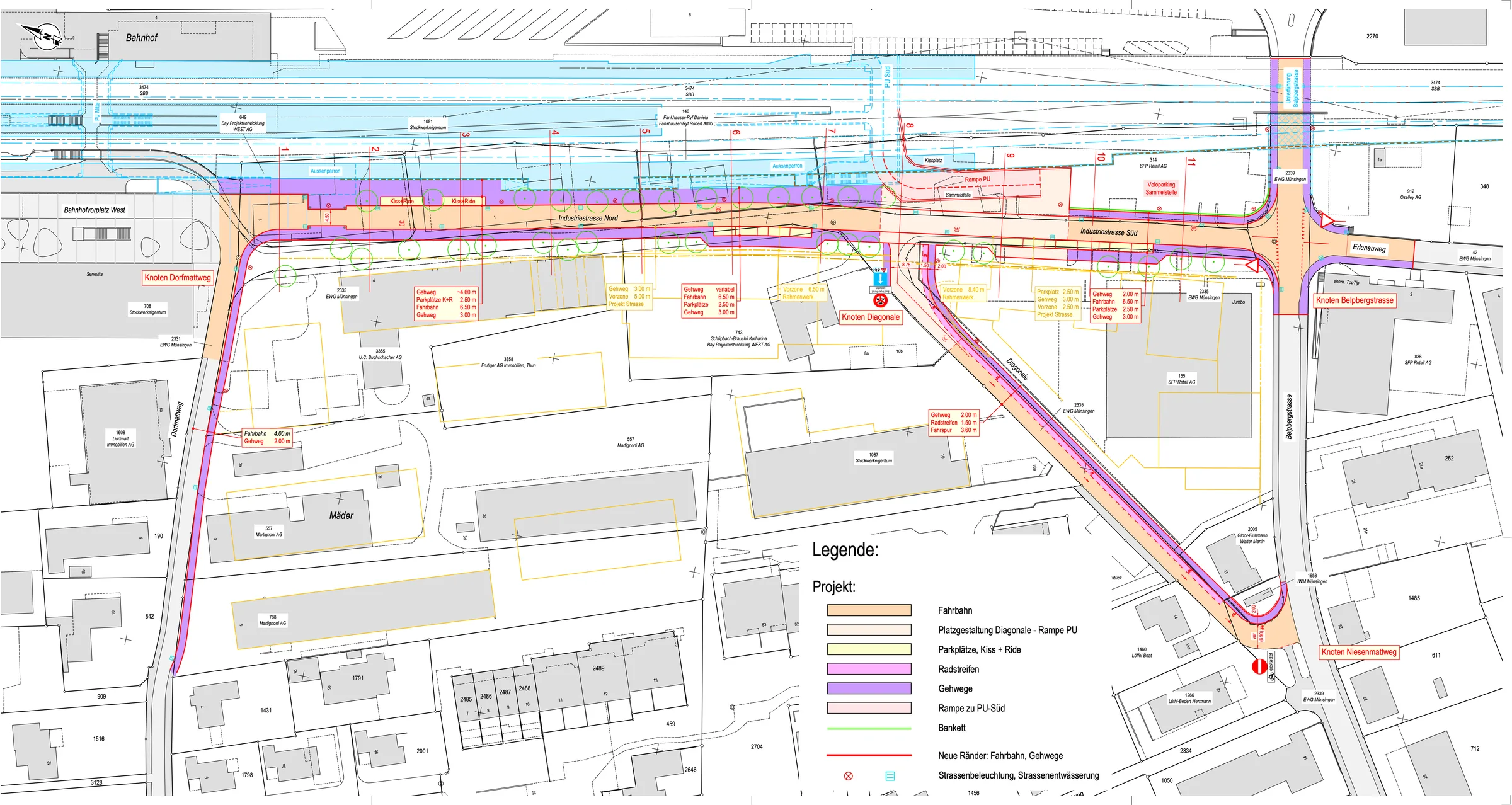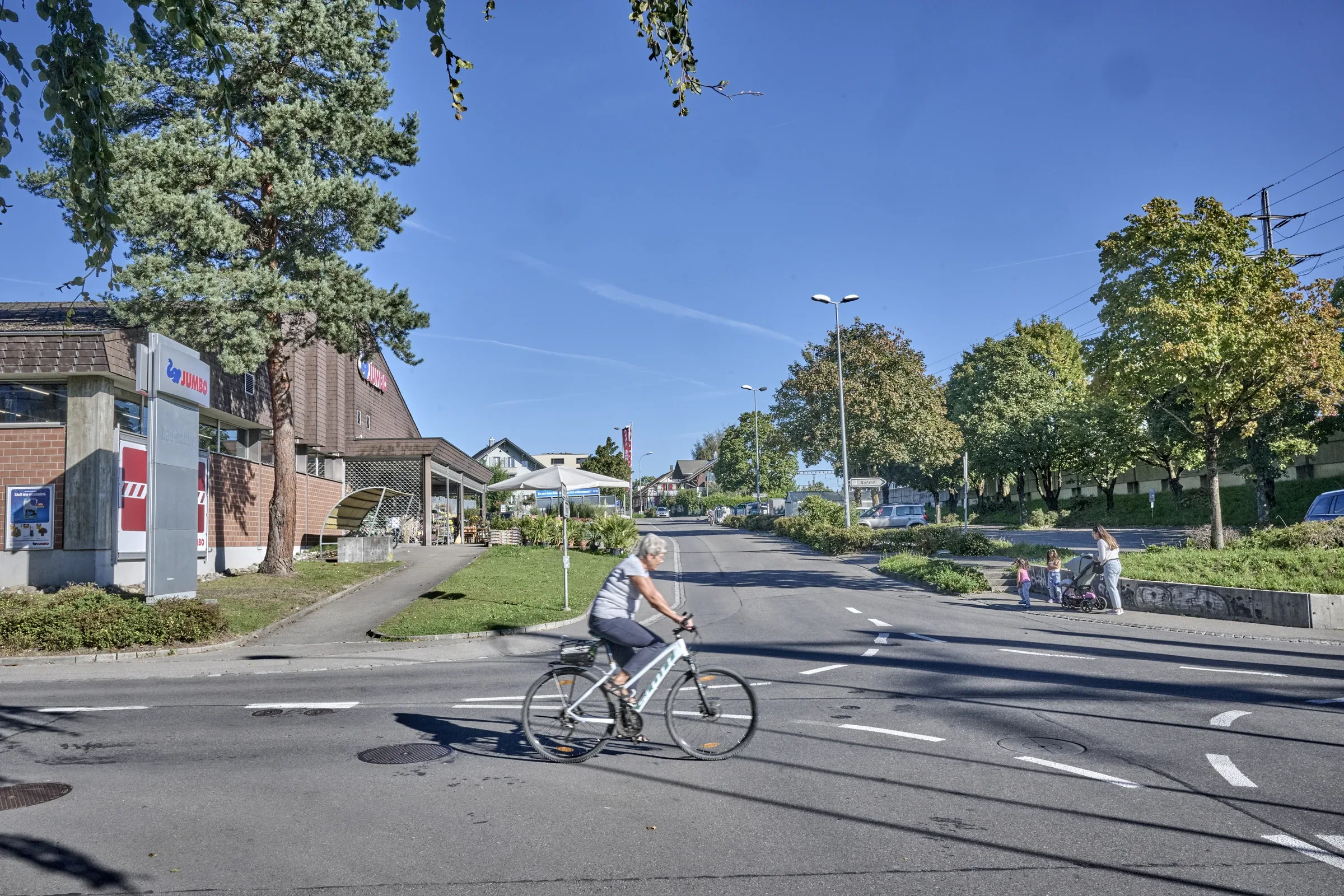 Für den Fuss- und Veloverkehr ist ein engmaschiges Wegenetz zur Erschliessung der einzelnen Gebäude vorgesehen. Das ermöglicht die optimale Anbindung des Gebiets an den Bahnhof und den östlichen Ortsteil. Durch die Siedlung führt von Nord nach Süd ein öffentlicher Fussweg. Die Industriestrasse ist eine wichtige kommunale und kantonale Veloverbindung und wird auch für den Fussverkehr attraktiv gestaltet. Sie wird in die bestehende Tempo-30-Zone integriert. Die Industriestrasse erhält beidseitig Trottoirs und der Dorfmattweg südseitig ein neues Trottoir. Zur Bahn gelangt man via die neue Personenunterführung Süd, die gestalterisch an das Quartier angebunden wird.