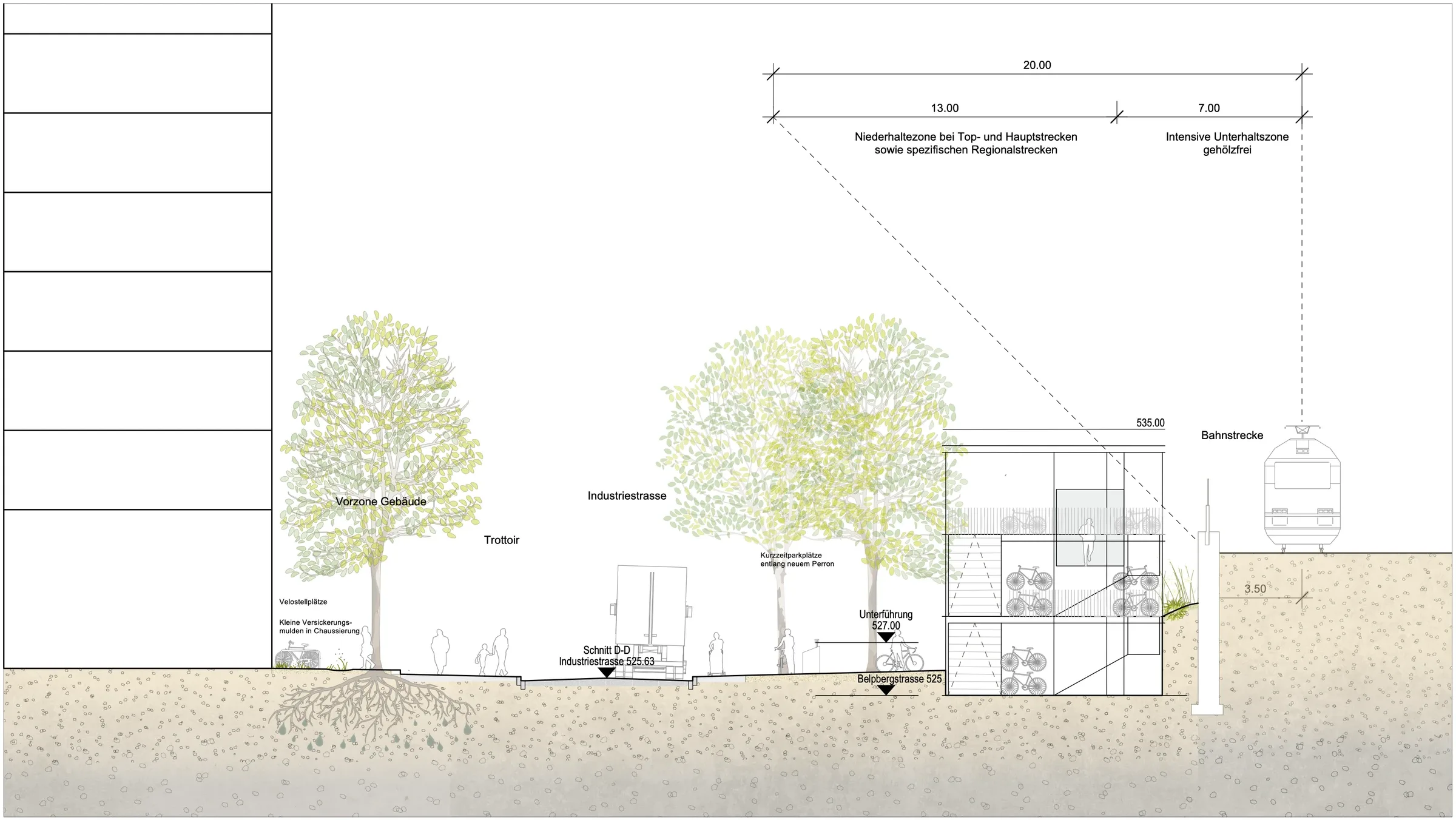 Im Bereich der heutigen Sammelstelle Bau und Hobby gibt es auch künftig eine Sammelstelle, zudem eine Veloabstellanlage (Bike+Ride) mit rund 130 öffentlichen Veloabstellplätzen.